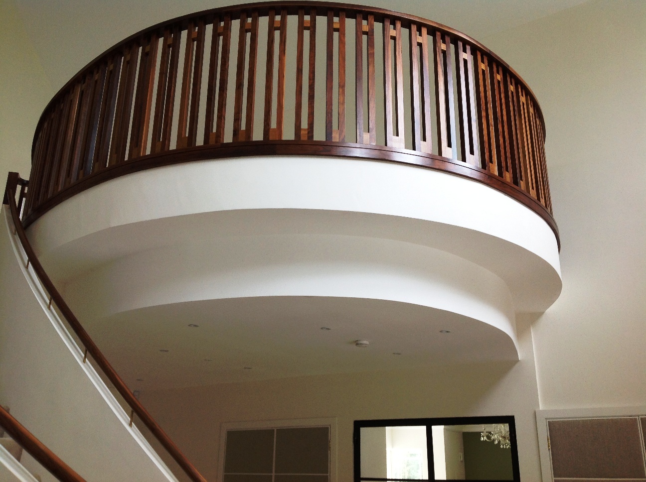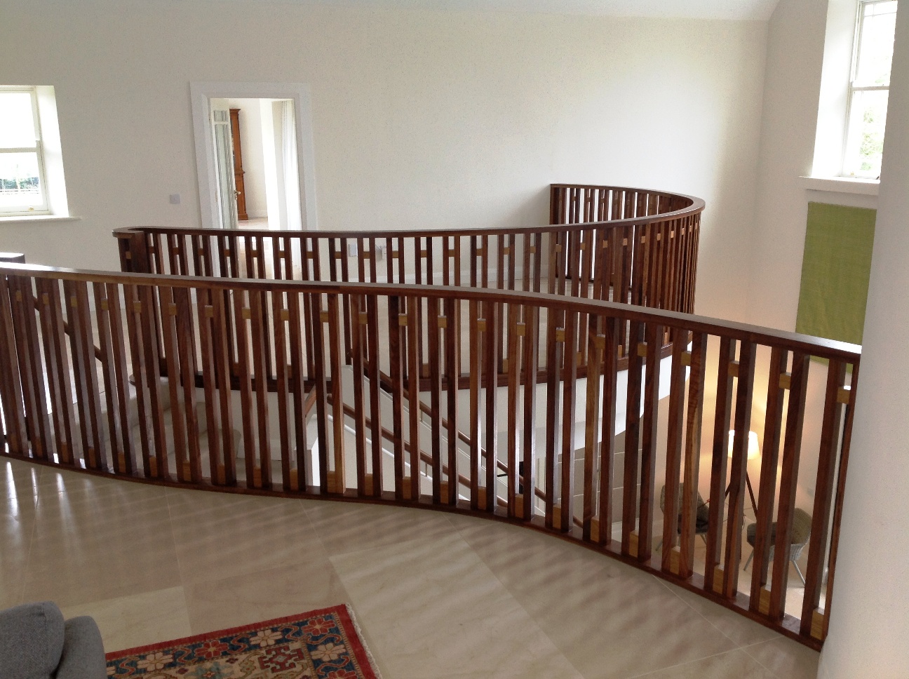Curved walnut and oak balustrade on landing.